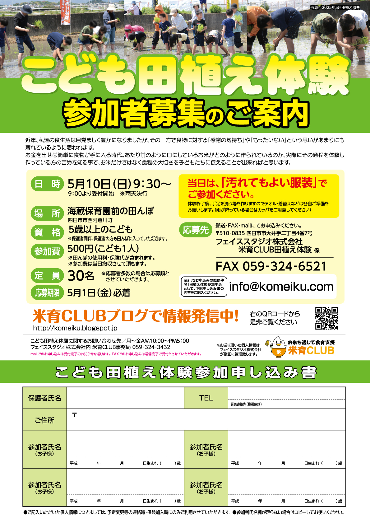 9:00受付 9:30スタート 1時間程度こども田植え体験 参加者募集
