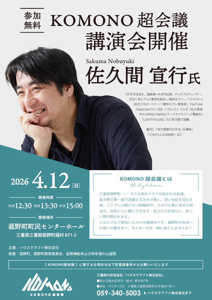 開場12:30 開演13:30 終演15:00KOMONO超会議 佐久間 宣行氏 講演会(参加無料)